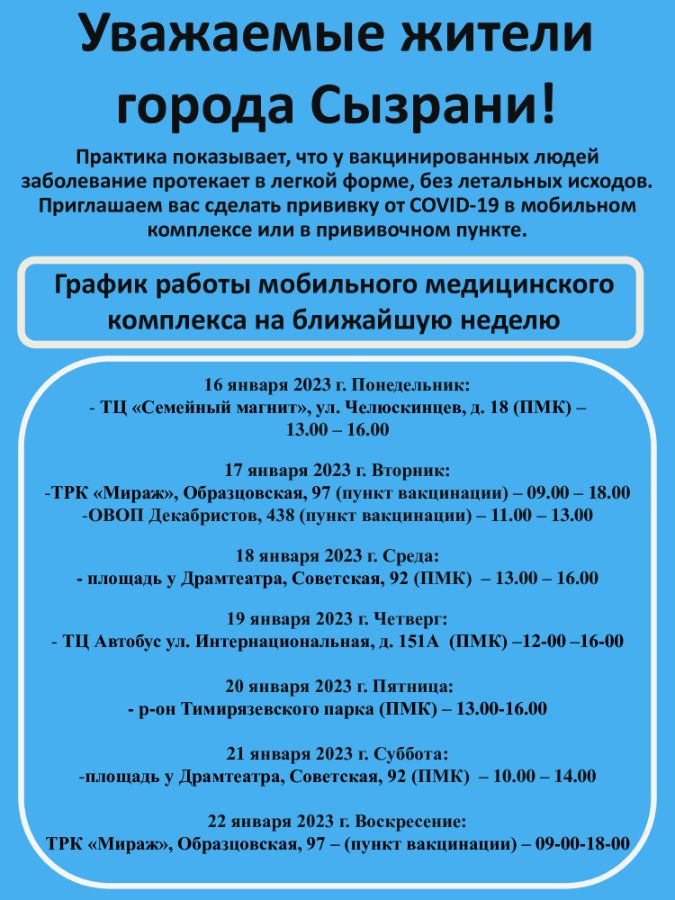 График работы мобильного прививочного комплекса с 16 по 22 января 2023 года